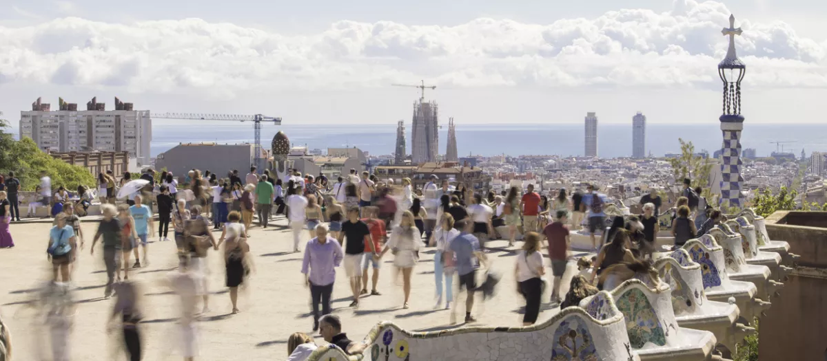 Vecinos y turistas en el Park Güell de Barcelona contemplan una panorámica de la ciudad