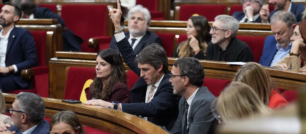 Los diputados de Junts, Mònica Sales (i) y Salvador Vergés (c), durante una sesión de control al Govern, en el Parlament de Cataluña, a 19 de noviembre de 2025, en Barcelona, Cataluña (España).Europa Press