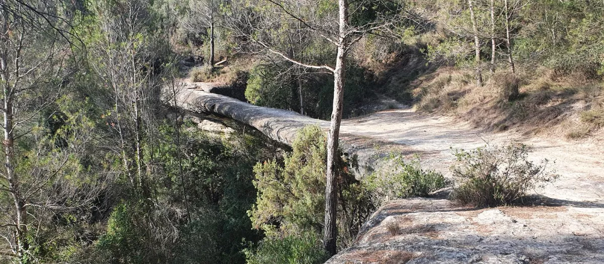 Este tramo de la ruta es el más cansado, ya que hay que subir durante unos 10 minutos por un sendero con bastantes piedras. Llegaremos a un cruce con una pista de tierra muy amplia. Al estar bien señalizado, giramos a la izquierda y avanzamos por esta pista unos 3 minutos. Llegará un momento en que veremos un sendero a mano izquierda que baja y, en la corteza de un tronco, unas líneas amarillas y blancas. Ahora tenemos que seguir por allí unos metros más, pero ya se ve a lo lejos el Pont de les Arnaules.