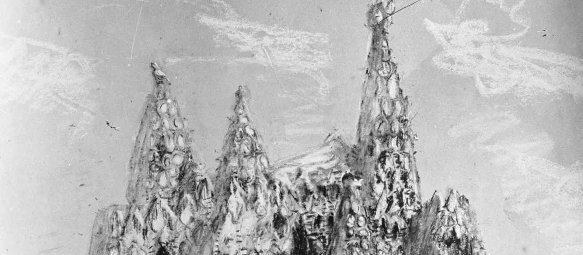 Detalle de un boceto a lápiz original de Gaudí de 1910 que representa la iglesia de la Colonia Güell