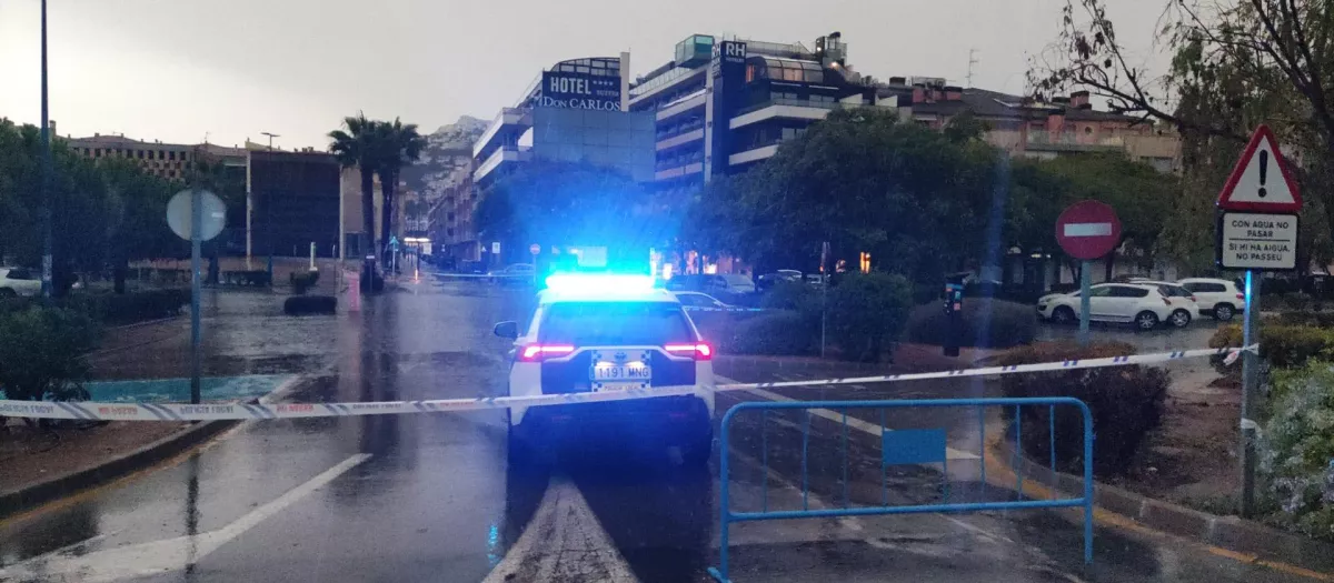 Imagen de la Policía Local de Peñíscola cortando una zona inundable del municipio.
