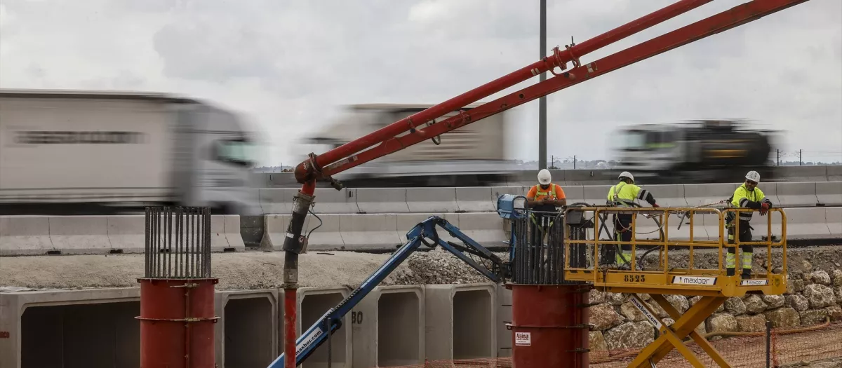Obras de emergencia para la reconstrucción de los puentes de la A-7 sobre el barranco del Poyo, a 30 de abril de 2025, en Quart de Poblet, Valencia, Comunidad Valenciana (España). Estos puentes fueron dañados tras la Dana del 29 de octubre en Valencia.
