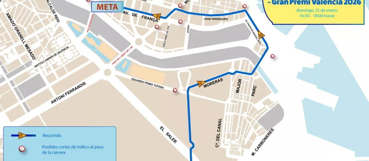 Por ello, la Policía Local ha previsto un dispositivo especial para este domingo 25 de enero. La zona de meta, ubicada en la avenida de Francia, entre Pintor Maella y la plaza de Europa, permanecerá cortada a la circulación entre las 08.00 y las 21.00 horas del domingo. Del mismo modo, está prohibido estacionar desde las 22.00 horas del sábado 24 de enero y hasta las 20.00 horas del domingo, en los dos sentidos del tramo indicado de la avenida de França.