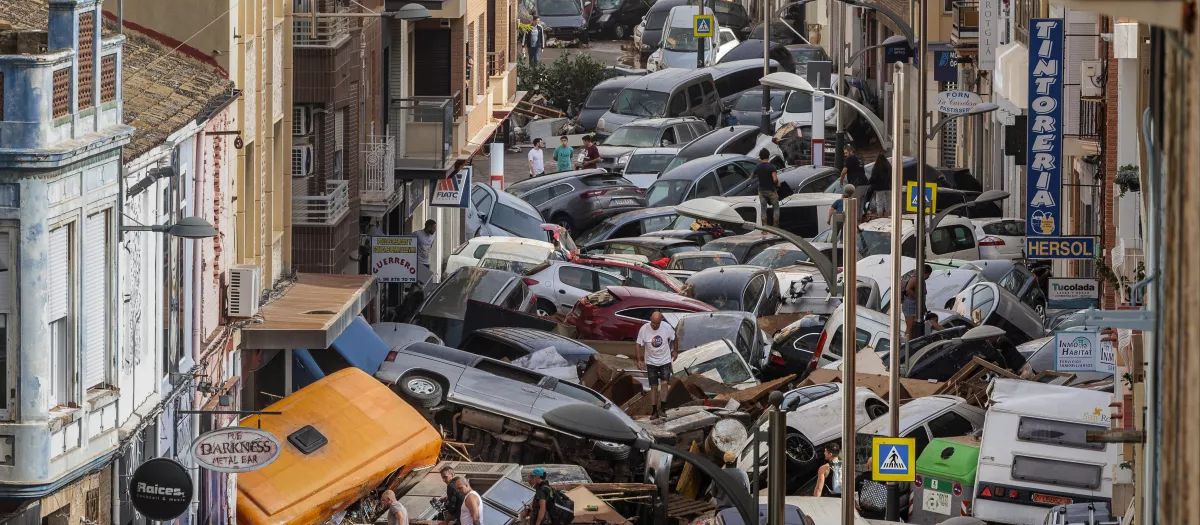 SEDAVÍ (VALENCIA), 29/11/2024.- Vista de la calle en Sedaví que amanecía abarrotada de vehículos arrastrados por la corriente un día después de la DANA, el pasado 30 de octubre de 2024. EFE/ Biel Aliño