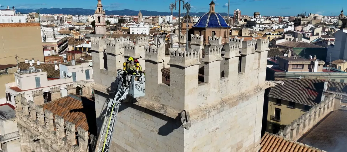Simulacro de incendio en la Lonja de Valencia, a vista de dron