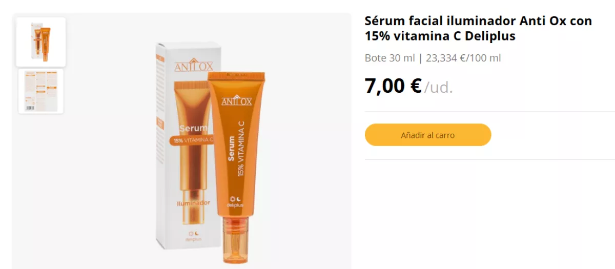 Es el caso del nuevo Sérum facial iluminador Anti Ox con 15 % vitamina C de Deliplus, que por apenas siete euros promete resultados similares a los de un sérum viral cuyo precio ronda los treinta.