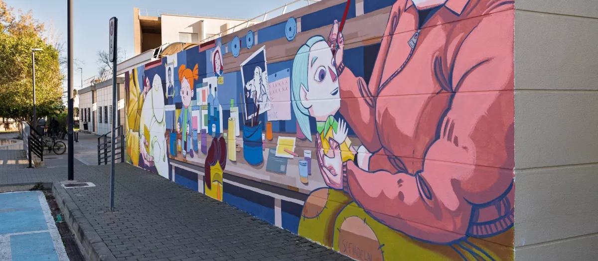 El mural está inspirado en algunos de los 'ninots' y escenas ganadoras de las dos ediciones celebradas hasta el momento del concurso 'La Ciència a les Falles', en la categoría de fallas infantiles.