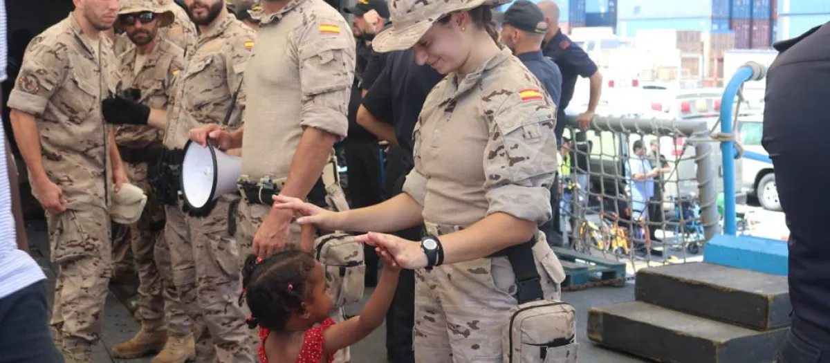 Una niña se despide de una militar española a su llegada a Yeda en la fragata Reina Sofía