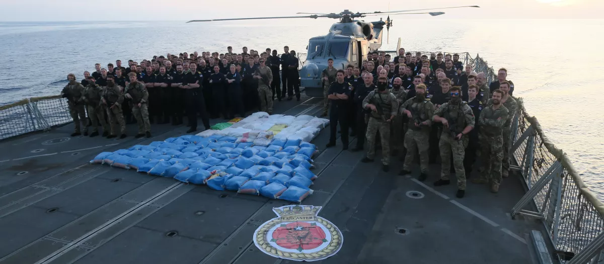 Estupefacientes ilegales incautados apilados en la cubierta de la fragata tipo 23 HMS Lancaster de la Marina Real Británica