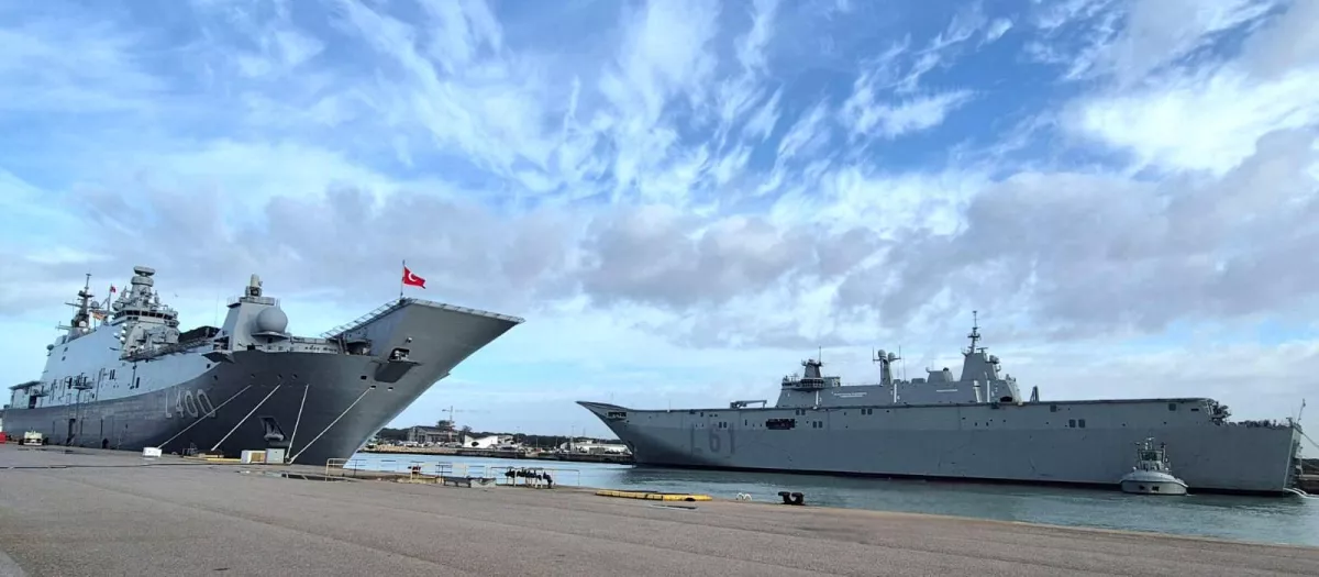 La base naval de Rota ha sido el escenario de una imagen que no se ve todos los días. El portaaeronaves L-61 Juan Carlos I permanece atracado cara a cara con el TCG Anadolu (L-400), el gemelo turco del Juan Carlos I, que fue botado el 19 de mayo de 2019 e inició sus pruebas de mar en marzo de 2022.