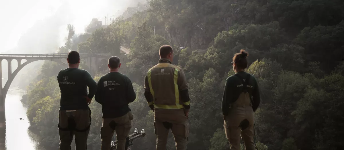 Cuatro personas observan el terreno calcinado en A Barca, Sober, Lugo