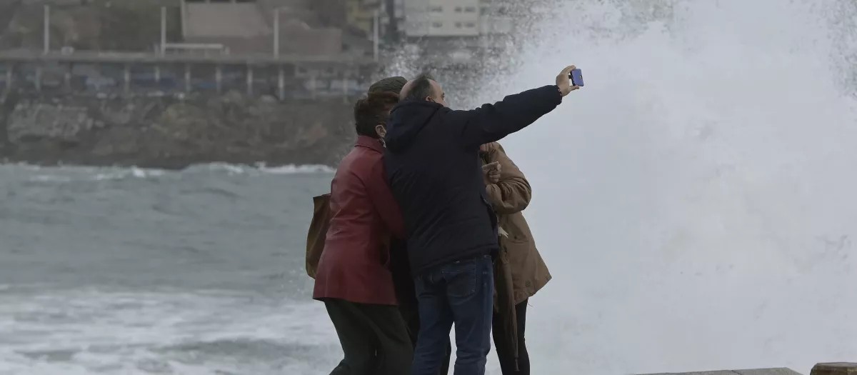 Un grupo de personas se hace una fotografía en la zona de las Esclavas, a 8 de diciembre de 2021, en A Coruña, Galicia, (España). La borrasca Barra ha hecho que la Xunta haya activado para todo el litoral gallego una alerta naranja por temporal costero. Según las previsiones de la Aemet, todo el litoral de la Comunidad mar combinado del noroeste podría registrar olas de cinco a siete metros para hoy. Además, para las costas del noroeste en otros puntos de la región, las olas podrían ser de seis a ocho metros junto a fuertes vientos.
