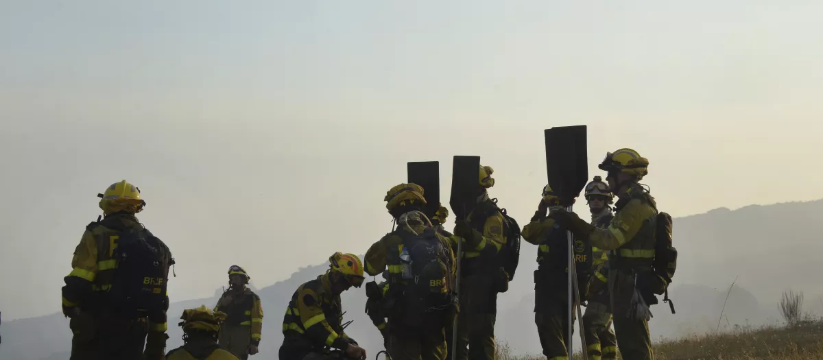 Brigada de Refuerzo de Incendios Forestales (BRIF) tras rematar su joranda en un incendio en Galicia