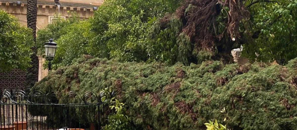 El temporal ha derribado un ciprés del Patio de los Naranjos, sin que haya que lamentar daños personales; el interior del primer monumento de Córdoba sigue abierto a las visitas