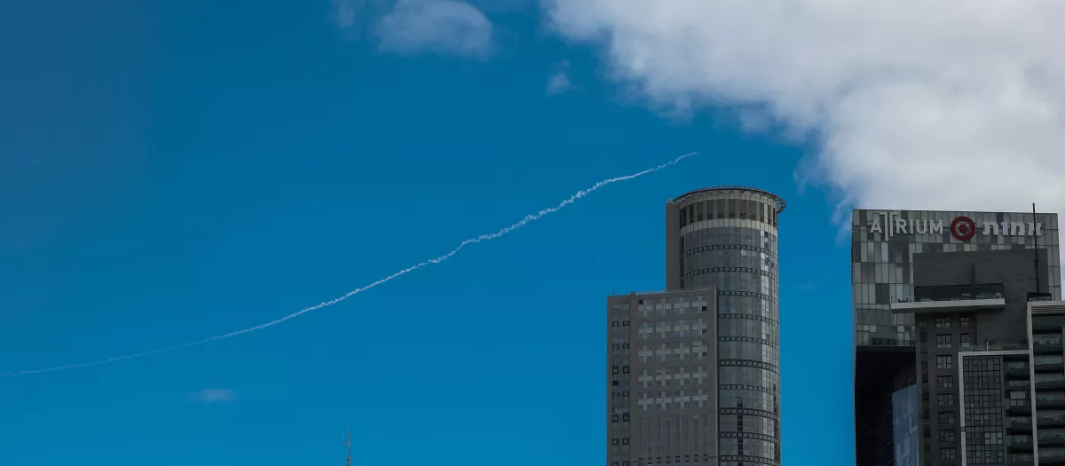 La estela de un cohete del sistema de defensa contra misiles Cúpula de Hierro de Israel se ve en Tel Aviv el 28 de febrero de 2026.