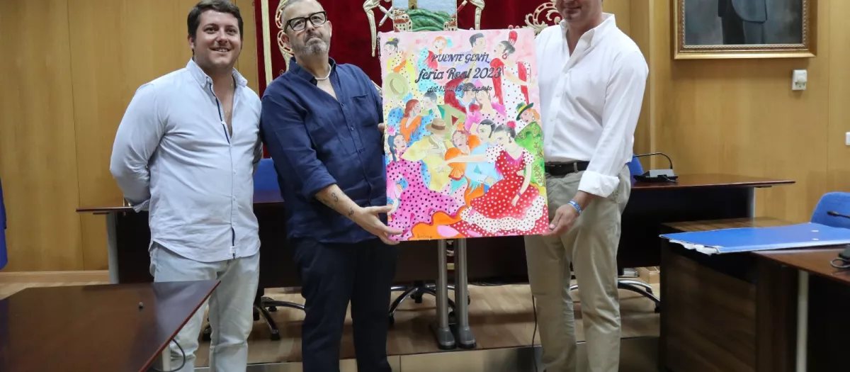 El alcalde de Puente Genil, Sergio Velasco y el concejal delegado de Festejos, Joaquín Reina, han presentado el cartel de la Feria Real 2023, elaborado por el pontanés Antonio Aguilar Avilés. En su comparecencia pública, el responsable de Festejos ha explicado que para la próxima edición de las fiestas de la localidad "hemos querido darle un gran protagonismo al cartel anunciador con una apuesta clara y firme por un artista rompedor e innovador como Antonio Aguilar, que representa un arte moderno que a la par puede conjugarse con unos estilos clásicos.