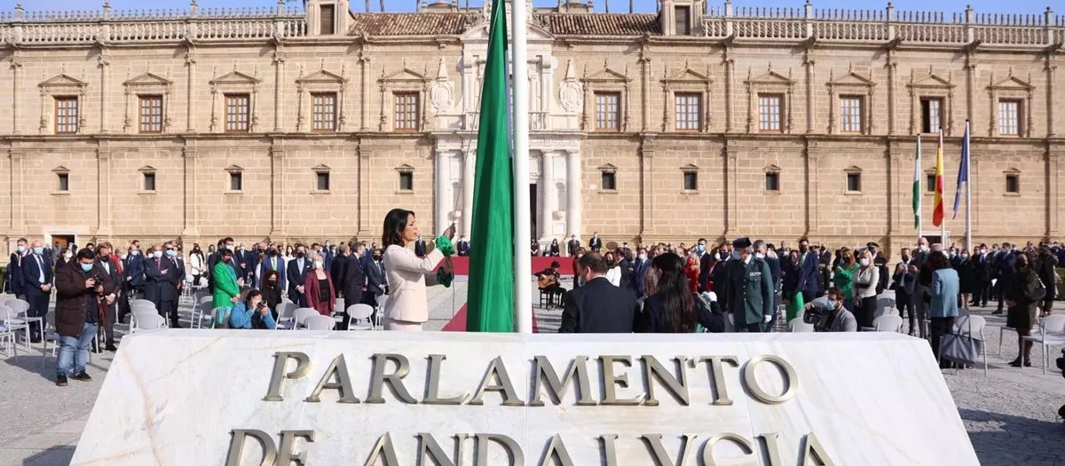 Izado de la bandera de Andalucía en el Parlamento andaluz durante el acto institucional por el 28-F celebrado en 2022