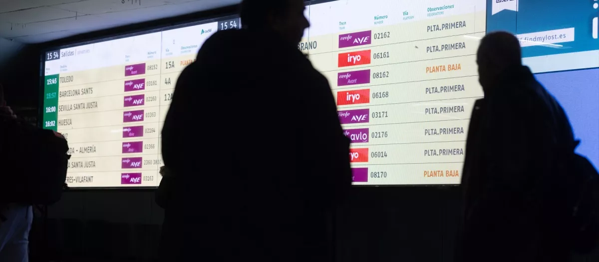 El primero de los trenes que debería de haber salido hace más de una hora de la estación es un AVE de Renfe programado a las 13.57 horas, pero que todavía no ha abandonado Atocha. A este tren se suman más AVE y otros trenes de Ouigo y de Iryo, que acumulan retrasos de entre 50 y 10 minutos.