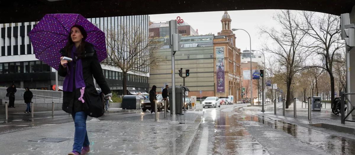MADRID, 02/03/2024.- Aguanieve y bajas temperaturas en Madrid, en la tarde de este sábado. La Agencia Estatal de Meteorología (Aemet) anuncia para mañana, domingo, en la Comunidad de Madrid intervalos nubosos, y en la sierra nuboso o cubierto, temperaturas mínimas en general en descenso suave y máximas sin cambios significativos o en aumento. La Aemet ha activado hasta las seis de la madrugada el aviso amarillo por nevadas que podrían acumular espesores de 5 centímetros de nieve en 24 horas, acumulaciones que se darán por encima de los 1.200 metros. EFE/Mariscal