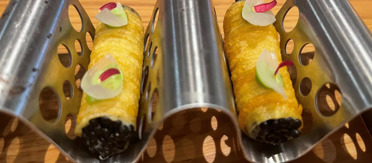 Abrazos dulces de Choco para regalarnos legados de historia cultura y costumbres en forma de calabaza «Enmelezá» unión de frescura y jugo de caña, flan deshecho de inolvidable textura custodiado por estrellas de azúcar culminado en un refrescante sorbete «verde que te quiero verde». La cocina de Kisko de García, mezcla de artesanía y orfebrería no podía sino alcanzar su clímax final en forma de «petit fours» escondidos en cofres de joyería cordobesa que rivalizarán en belleza con algunos de los colgantes, pulseras y pendientes que contiene una misteriosa caja de madera, símbolo de luz deslumbrante en la gastronomía, tambor de alegría y pasión por un arte culinario vanguardista y atrevido con el que Kisko García alcanza el olimpo culinario.