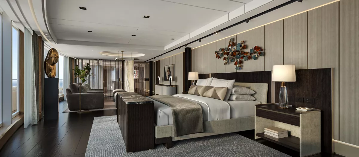 La Skyview Regent Suite es solo una de las doce categorías de suites del barco, todas con balcón privado. Estrena nuevas categorías diseñadas por Studio DADO: Skyview Suites (dúplex con terraza privada en cubierta y ascensor interior), Grand Loft Suites (dúplex con ventanales de doble altura) y Horizon Penthouse Suites (con balcones de gran formato).