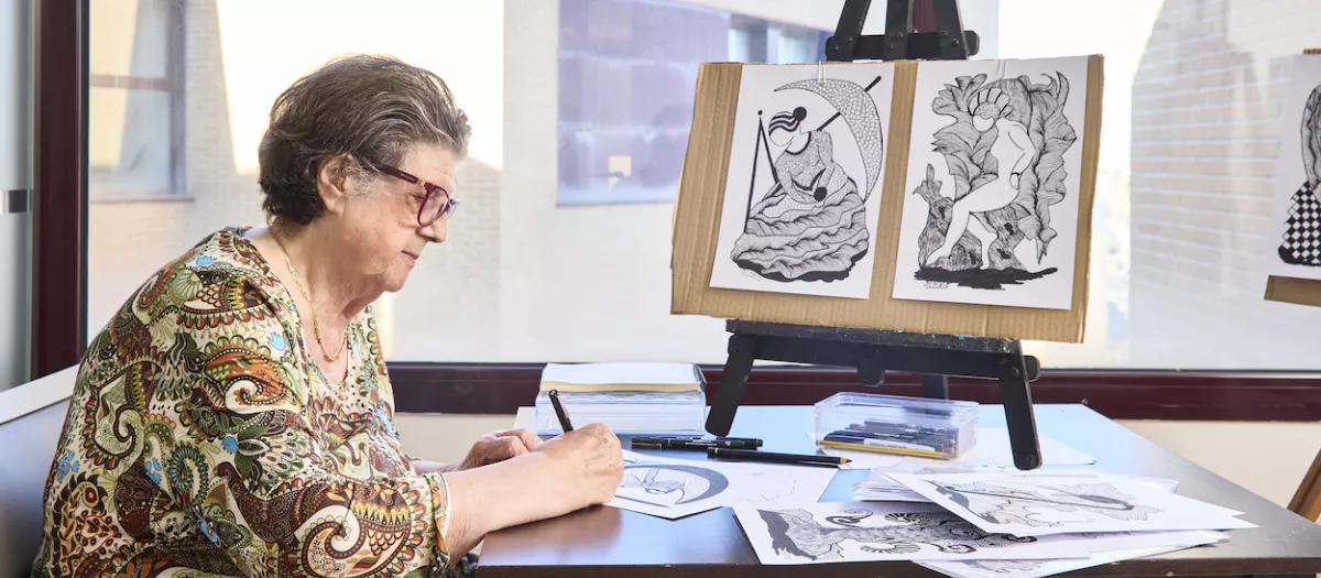 Una persona mayor participa en una actividad de pintura en un centro de día