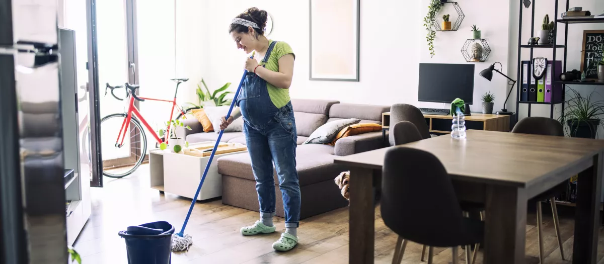 Una mujer embarazada pasando la fregona