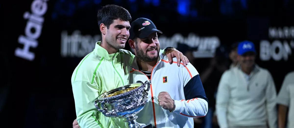 Carlos Alcaraz feliz junto a su hermano Álvaro con el trofeo, tras ganar el Open de Australia
