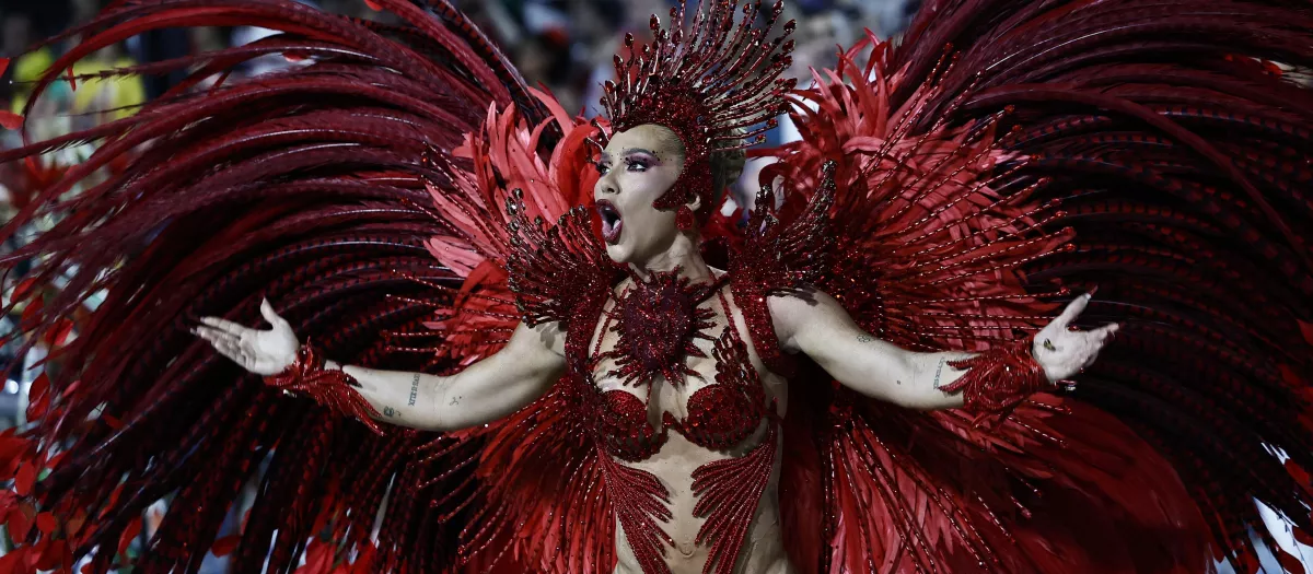 Vestida con un lujoso traje rojo brillante, pero con muchas transparencias, con pedrería y plumas que evocaban el tema que inspiró el desfile de la escuela, Fonseca cruzó los 700 metros del sambódromo al frente de los cerca de 300 percusionistas de la «Invocada», como se conoce a la 'batería' (orquesta) de Grande Río.