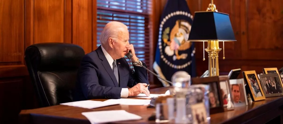 En una foto difundida por la Casa Blanca, se observaba a Biden sentado en un escritorio lleno de fotos familiares y luciendo un traje azul oscuro con una corbata con grabados del mismo tono mientras sostenía el auricular del teléfono.