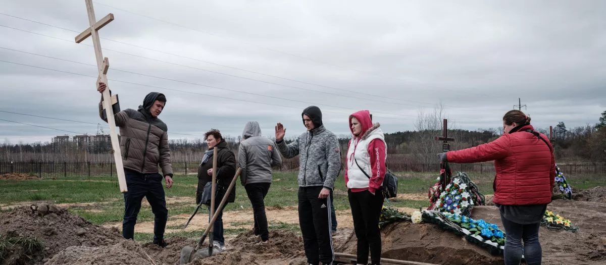 Familiares de las víctimas, celebraron un oficio religioso junto a la fosa común de Bucha