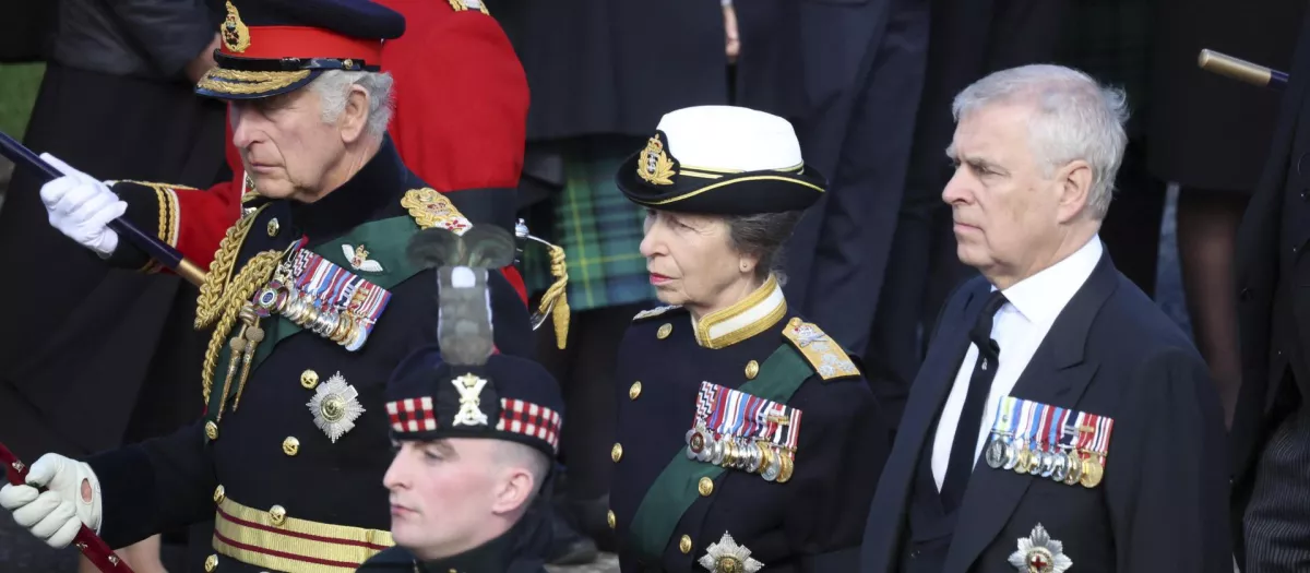El Rey, Carlos III, su hermana, la princesa Ana y el duque de York, el único de los hermanos con chaqué al tener prohibido usar el uniforme militar, durante el funeral de la Reina Isabel II