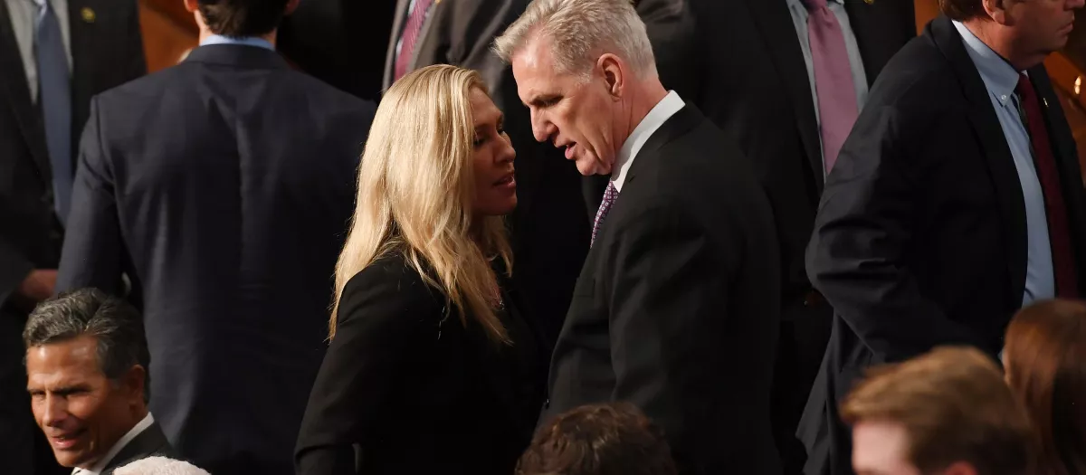 Kevin McCarthy, favorito como presidente de la Cámara Baja, habla con Taylor Greene, durante la segunda jornada de votaciónAFP