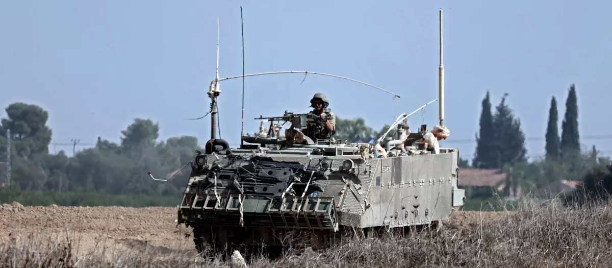 Un vehículo blindado del Ejército israelí avanza en un campo cerca de la ciudad de Sderot, en el sur de Israel