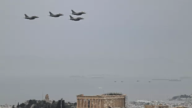 Aviones militares griegos sobrevuelan la Acrópolis de Atenas