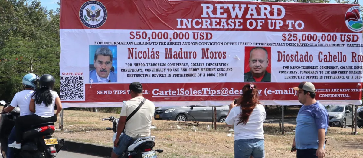 En la valla, en inglés, está la recompensa de 50 millones de dólares que EE.UU. ofrece por Maduro y de 25 millones de dólares por Cabello, por delitos como «conspiración para el narcoterrorismo» y exportar cocaína, entre otros.