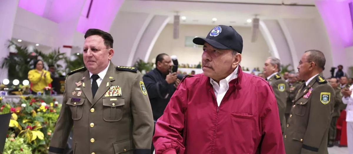 El dictador nicaragüense Daniel Ortega (centro) junto al jefe del Ejercito Julio Cesar Avilés