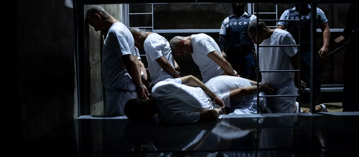 Miembros de la organización criminal venezolana Tren de Aragua y de la pandilla salvadoreña MS-13 a su llegada al CECOT en la ciudad de Tecoluca, El Salvador