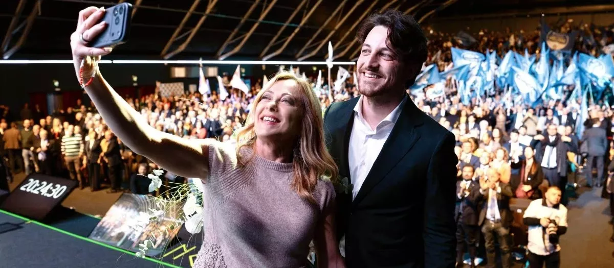 Alberto Stefani, vencedor de las elecciones en el Véneto, junto a Meloni