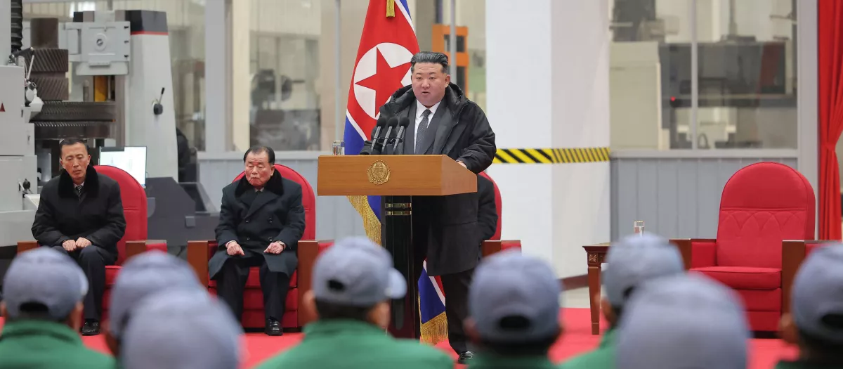 Kim Jong Un pronunciando un discurso al finalizar la primera fase de renovación y modernización del Complejo de Máquinas Ryongsong en la provincia de Hamgyong del Sur, Corea del Norte