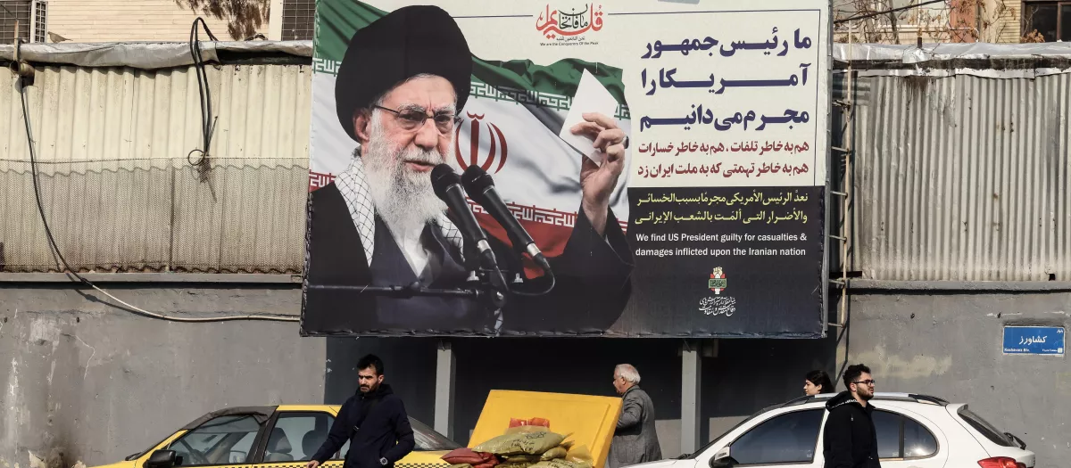 Los iraníes pasan junto a una valla publicitaria que muestra al líder supremo iraní, el ayatolá Ali Khamenei, con retórica antiestadounidense en TeheránAFP