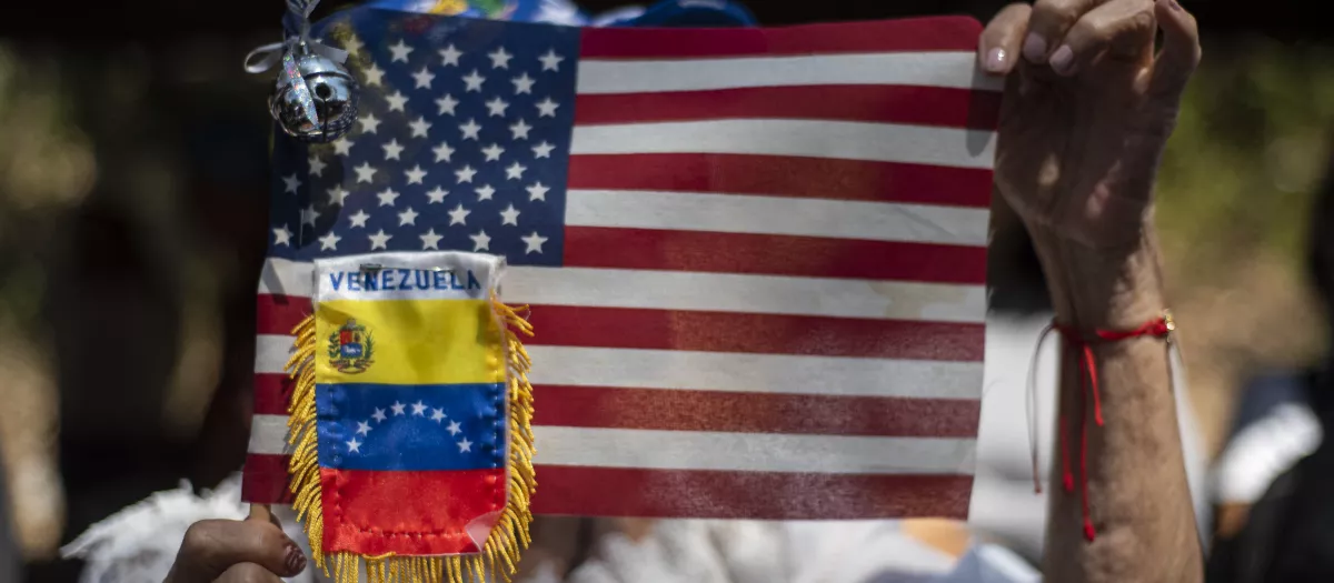 Manifestantes sostienen banderas de Venezuela y Estados Unidos durante una marcha estudiantil, en Caracas, VenezuelaNurPhoto via AFP