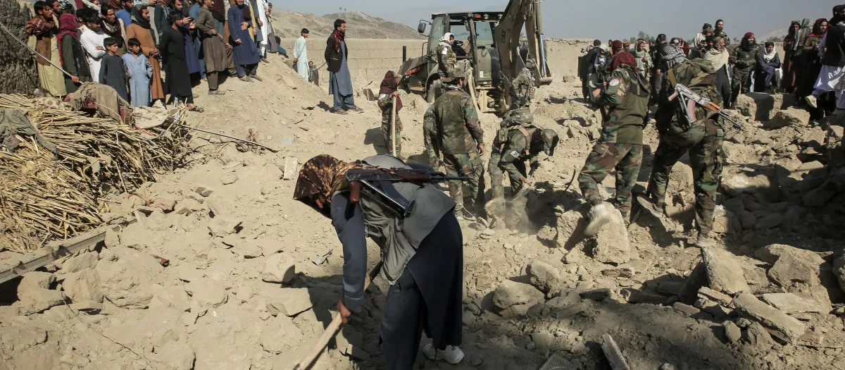El personal de seguridad talibán busca víctimas después de un ataque aéreo paquistaní nocturno contra Nangarhar