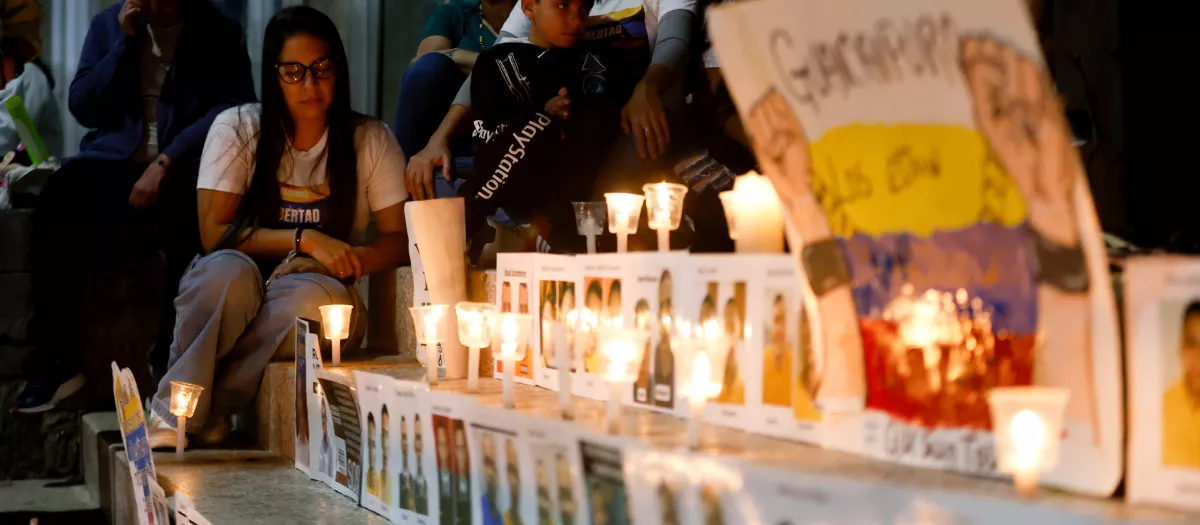 La gente participa en una vigilia para exigir la libertad de los presos políticos frente al edificio El Helicoide, sede del Servicio Bolivariano de Inteligencia Nacional (SEBIN), en Caracas