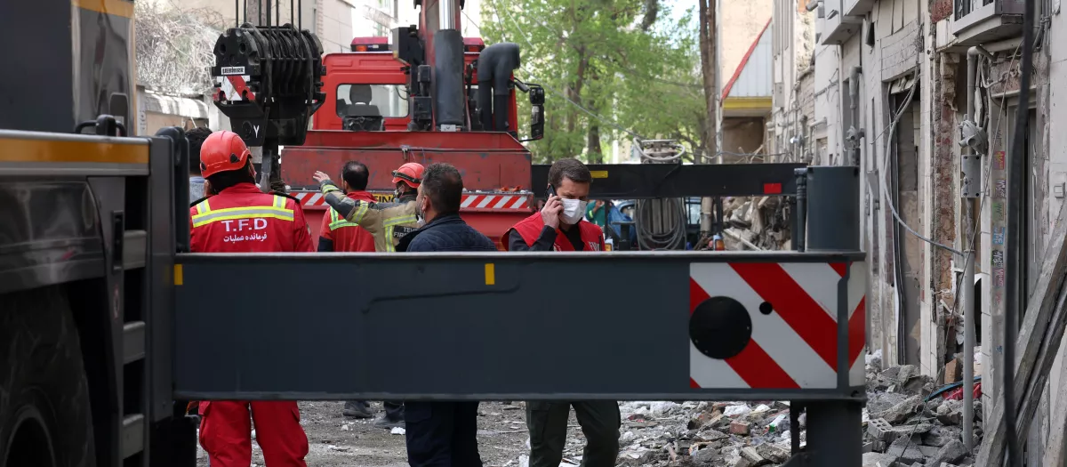 omberos buscan víctimas e inspeccionan los daños en un edificio residencial al sur de Teherán