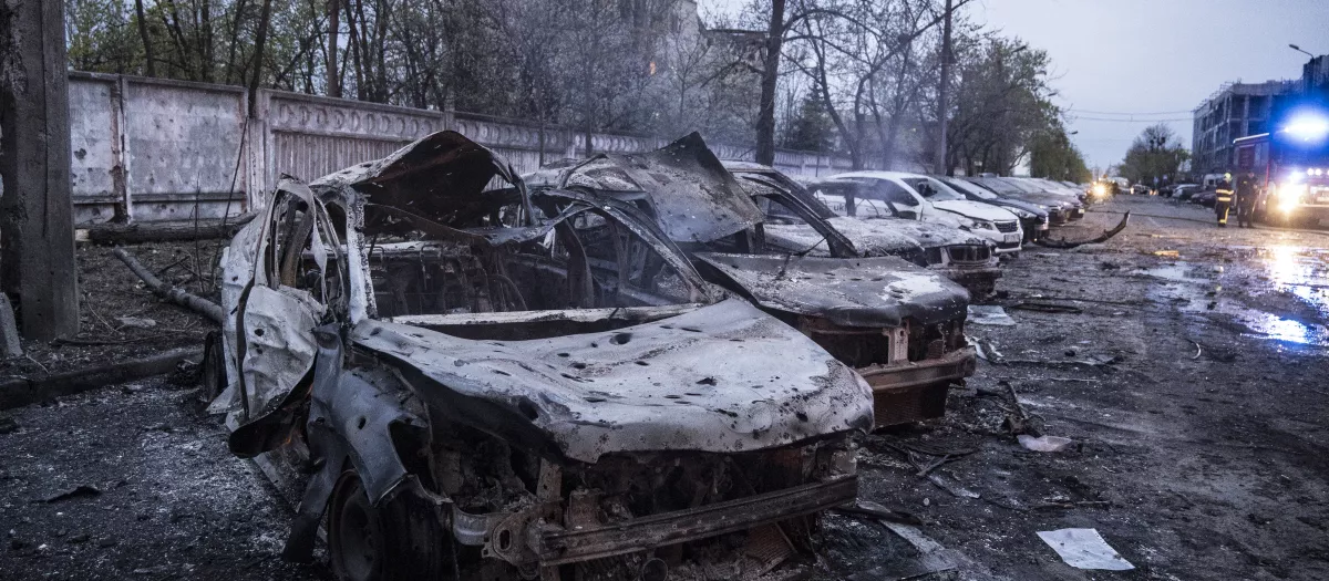 coches calcinados tras un ataque ruso en Kiev