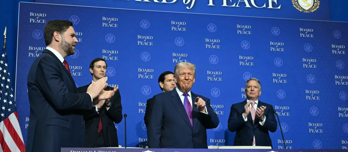 El presidente Donald Trump y sus colaborares más cercanos en un acto de la Junta de Paz en Washington