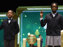 Los niños de la Residencia San Ildefonso de Madrid Piero Rai Chávez (d) y Alisce Ríos (i), muestran el número 72.480, el Gordo de Navidad, dotado con 4.000.000 euros a la serie