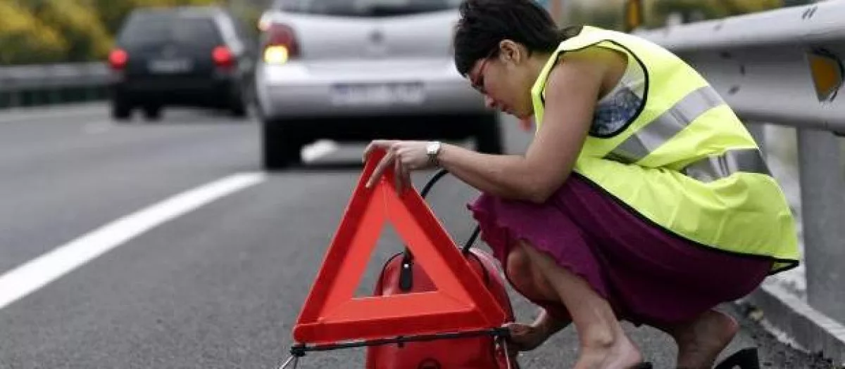 Una conductora coloca los triángulos de emergencia con el chaleco puesto
