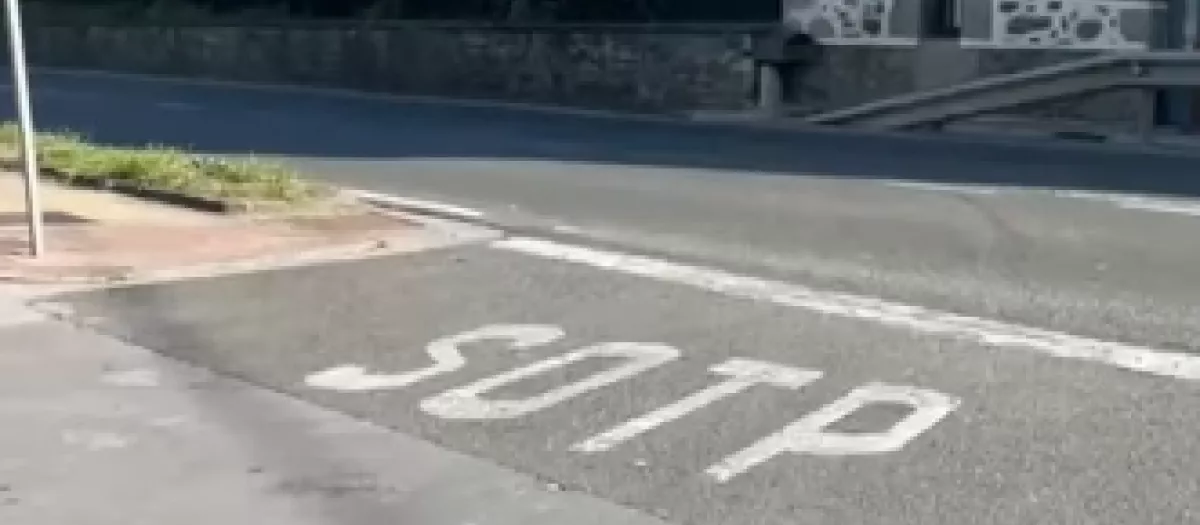 En la misma y a pesar de que debería leerse STOP, puede leerse la palabra SOTP, sin duda una errata o un problema disléxico del operario que la pintó hace ahora una década y del que solo se han dado cuenta los operarios de una bar y los de una gasolinera cercana.